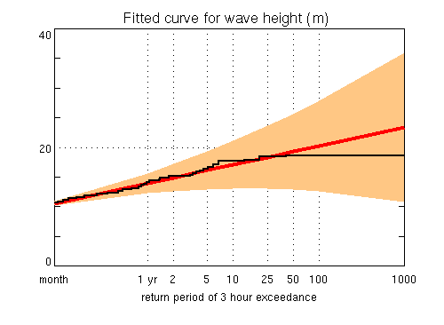 The fitted curve above shows wave height versus the fraction of time that it is exceeded. By default, the fraction of time is expressed as the return period of 3 hours of exceedance. This means that we assume a typical storm duration of 3 hours. We also assume that if the waves exceed a certain extreme value, they will do so during the whole storm or interval. Depending on the area of interest, you might prefer an average storm length of 6 or even 12 hours. The red line is the fitted curve and indicates the average exceedance value (or fractile). The area shaded orange indicates the 90% confidence interval of the exceedance value. From a standard set of fractions, only the fractions which are smaller than the fraction of the data exceeding the threshold are used for the plot. Apart from the fitted curve, the plot shows the sample distribution (stepped solid black line). Stepsize used for wave height is 0.25 m. Stepsize used for wind speed is 0.5 m/s or knots (depending on your preferences). From the plot above, you can see that the return period of a wave above 15 m, or better the return period of a storm with a duration of 3 hours in which a wave occurs higher than 15 m, is about 5 years. Now, one can determine the probability that a wave higher than 15 m will occur during longer periods of for instance 10, 100 or 1000 years.